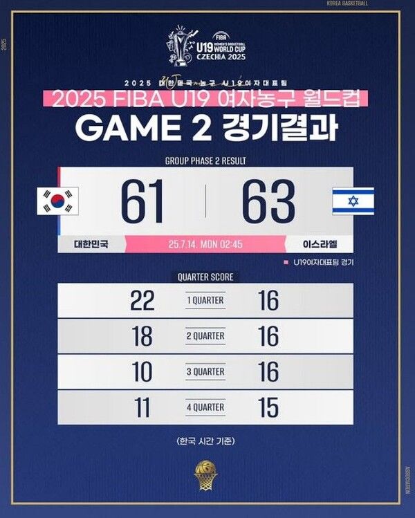 19세 이하(U-19) 여자농구 대표팀이 이스라엘전 석패로 2025 국제농구연맹(FIBA) U-19 여자농구 월드컵 첫 승을 놓쳤다.