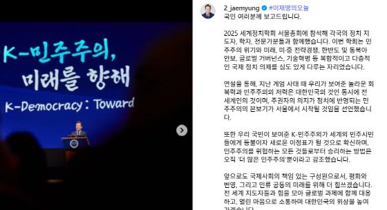 14일 이 대통령은 인스타그램을 통해 “2025 세계정치학회 서울총회에 참석해 각국의 정치 지도자, 학자, 전문가분들과 함께했다”며 “이번 학회는 민주주의의 위기와 미래, 미·중 전략경쟁, 한반도 및 동북아 안보, 글로벌 거버넌스, 기술혁명 등 복합적이고 다층적인 국제정치 의제를 심도 있게 다루는 자리였다”고 소개했다.