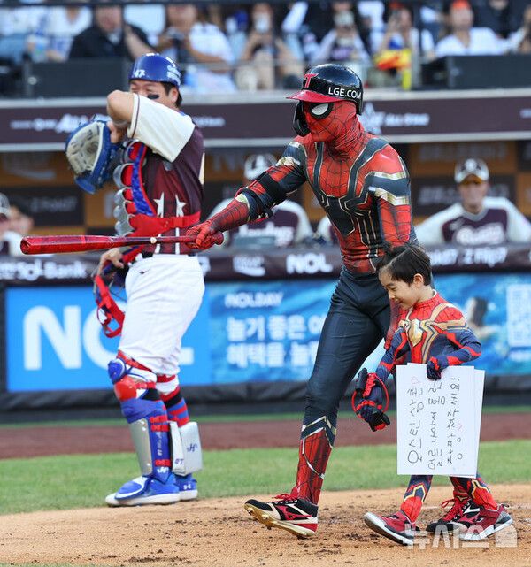 자신의 트레이드마크인 호수비를 강조하는 스파이더맨 복장을 입고 등장한 그는 아들 이든군과 함께 그라운드에 나서 팀 동료 홍창기와 오스틴 딘을 향한 응원의 메시지를 보냈다.