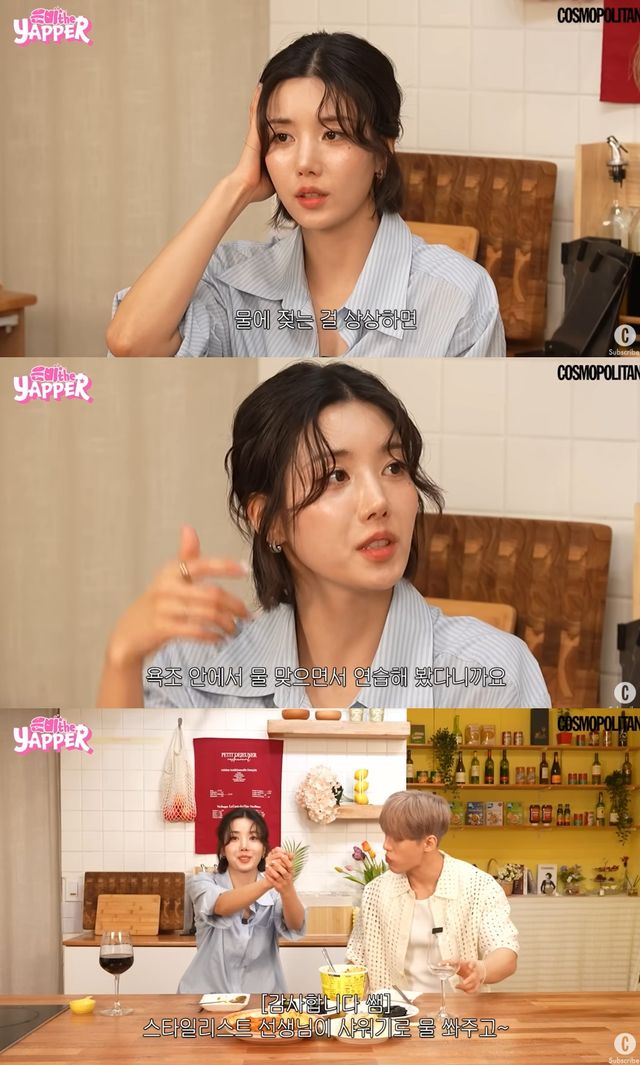 권은비는 헤어스타일 등을 선정할 때도 물에 맞은 후를 상상하고 메이크업의 유지력에도 신경을 쓰며 "2023년에 워터밤을 처음 나갔는데 감이 안 와서 욕조에서 물 맞고 연습했다. 샤워기로 물을 쏴주면 연습했다"고 전했다.