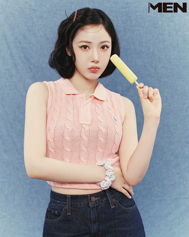 핑크 슬리브리스 니트 톱 Polo Ralph Lauren, 데님 팬츠 Levi’s, 스크런치 Glowny.