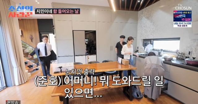 김준호는 이에 감사함을 표하면서도 “난 뭘 해야 하나?”라고 물었고, 김지민은 “그냥 눈치껏 움직이면 된다. 앉아만 있지 말고 뭐라도 하는 시늉을 하라”고 조언했다. 그 말대로 김준호는 “전등을 교체한다거나 집에 할 일 없나?”라고 물었으나 김지민의 어머니는 “손님이니 그냥 앉아 있으라”고 일축, 큰 웃음을 자아냈다.