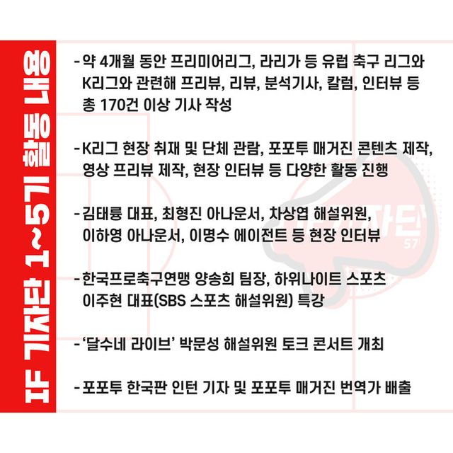 지난 2023년 3월 출범한 <IF 기자단>은 총 5기를 배출했으며 각 기수마다 약 4개월 동안 프리미어리그, 라리가 등 유럽 축구 리그와 K리그와 관련해 프리뷰, 리뷰, 분석기사, 칼럼, 인터뷰 등 총 600건 이상의 기사를 작성했다.