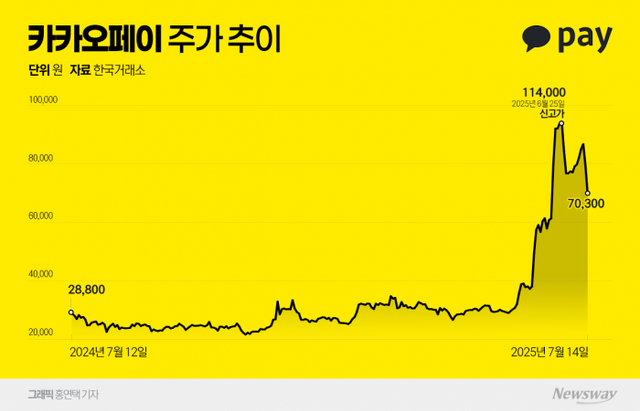 14일 한국거래소에 따르면 이날 카카오페이의 주가는 전 거래일 대비 9900원(12.44%) 하락한 6만9700원에 거래를 마쳤다. 지난달 장 중 11만원 선을 기록한 이후 가파른 하락세를 기록했다.