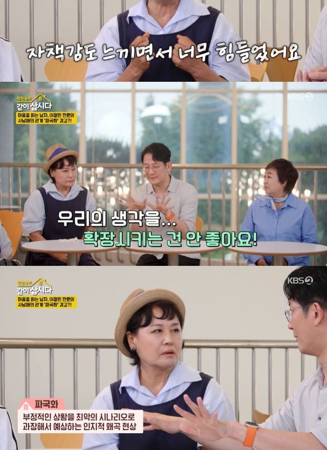 이를 들은 박원숙은 "지난날을 자꾸 되짚어보는 거다"라며 "이게 리얼 프로그램인데 혜은이랑 내가 그만둬야 하는 건가"라는 생각까지 했음을 드러냈고, 그러자 이광민 전문의는 "그걸 파국화라고 한다"고 분석했다.
