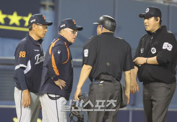 27일 오후 잠실야구장에서 열린 2025 프로야구 한화와 LG 경기. 한화 김경문 감독이 7회 LG 이영빈의 체크스윙 관련 항의하고 있다. 잠실=정시종 기자  /2025.05.27.
