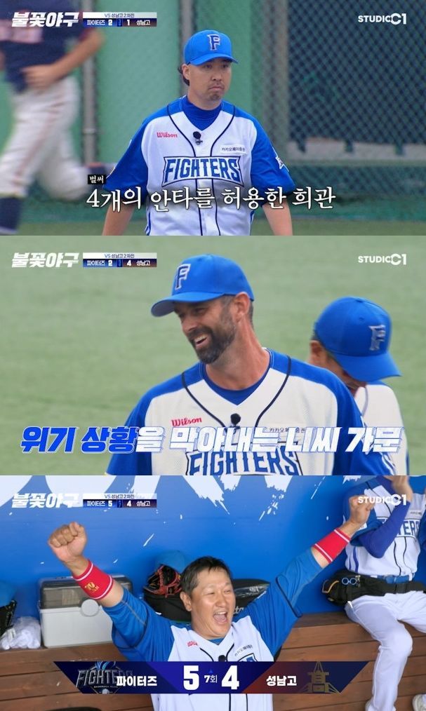 파이터즈가 역전에 성공했지만, 방심은 금물. 서울 성남고는 5회 말, 2사 주자 1, 2루의 상황에서 흔들리는 유희관을 상대로 3연속 안타를 터트리며 2:4로 다시 역전했다. 기세가 상대 쪽으로 기울자 김성근 감독은 유희관을 내리고 2025시즌 첫 출전인 니퍼트를 기용해 고비를 넘겼다.
