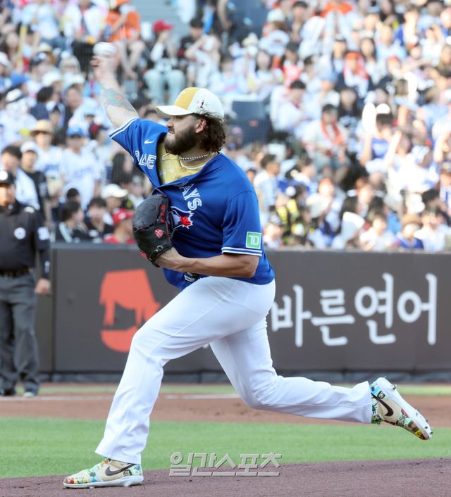 2025 신한 SOL뱅크 KBO 올스타전이 12일 오후 대전 한화생명볼파크에서 열렸다. 나눔팀 선발 폰세가 팀 동료 류현진의 MLB 시절 토론토 유니폼을 하고 피칭하고 있다. 대전=정시종 기자 capa@edaily.co.kr