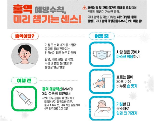 질병청은 생후 12∼15개월과 4∼6세 시기의 국가예방접종(MMR 백신) 2회 접종이 중요하다며, 12개월 미만 영아는 동남아 여행을 자제하거나 출국 전 가속접종(6~11개월 1차 접종)을 받을 것을 권고했다.