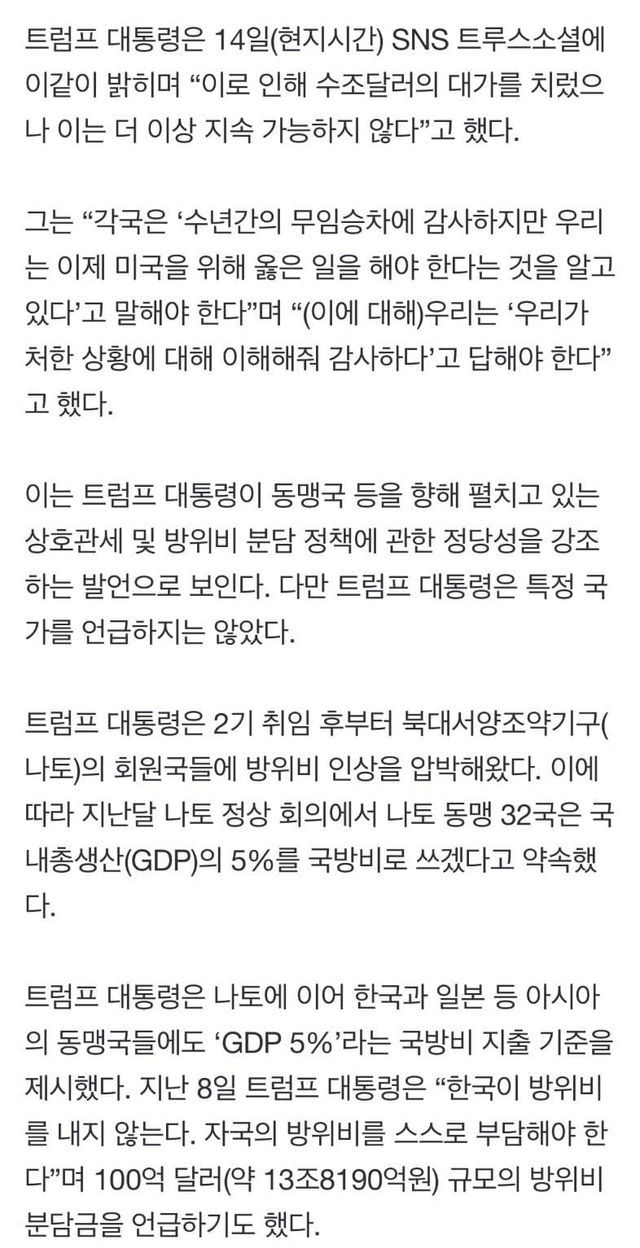 트럼프 : 한국은 이제 무임승차 하지마라 ㅇㅇ