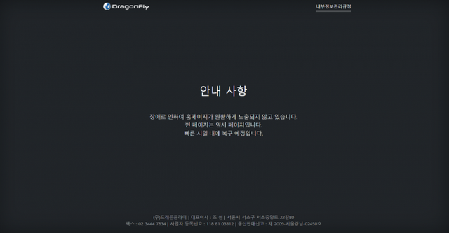 드래곤플라이 홈페이지에 장애가 발생했다. 사진=드래곤플라이 임시 홈페이지 갈무리.