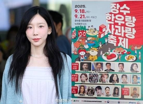 앞서 14일 온라인 커뮤니티에는 태연이 '장수 한우랑 사과랑 축제' 출연진 라인업에 포함된 포스터가 게재, 지역 축제에 참여한다는 소식이 화제가 됐다.