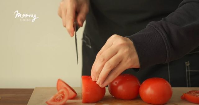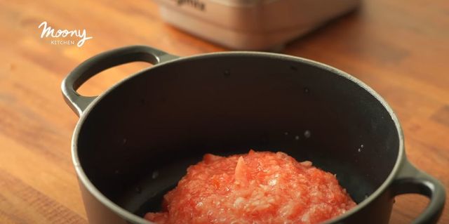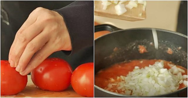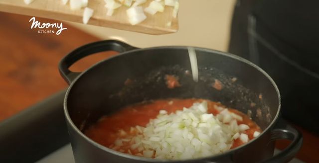 먼저 팬에 식용유를 약간 두르고 다진 마늘과 잘게 썬 양파를 볶는다. 양파가 투명해질 때까지 중불에서 천천히 익히는 것이 중요하다. 이때 양파는 최대한 오래 볶을수록 단맛이 깊어진다. 그다음 잘게 썬 토마토를 넣고 함께 볶다가 물 반 컵 정도를 부어 약간 끓여준다.