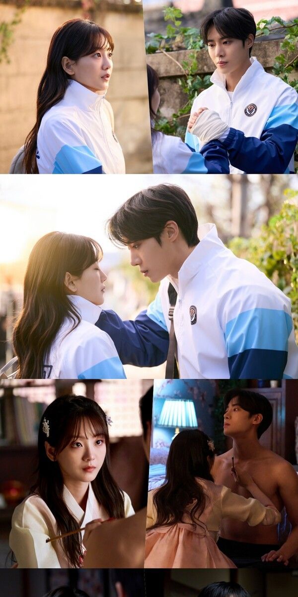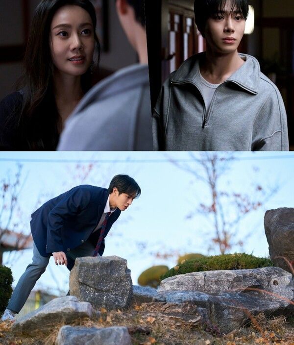 사진 속 박성아와 배견우는 맞잡은 손을 꼭 잡은 채 서로의 눈을 바라보며 감정을 나누고 있다. 입술이 닿기 직전, 눈을 감고 있는 박성아에게 조심스레 다가가는 배견우의 모습은 두근거림을 자아낸다. 설렘과 동시에 긴장감을 유발하는 것은 또 있다. 박성아가 배견우인지 악귀 봉수인지 알 수 없는 인물의 몸에 부적을 새기고 있는 장면, 그리고 이를 지켜보는 염화(추자현 분)의 광기 어린 눈빛은 향후 전개에 대한 궁금증을 더욱 증폭시킨다.