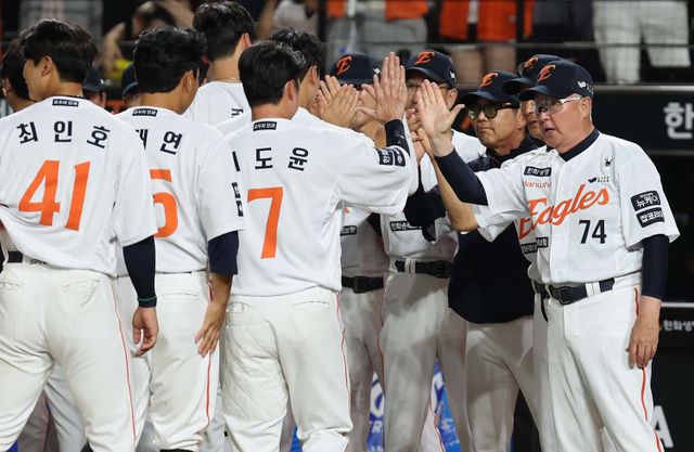 9일 오후 대전 한화생명 볼파크에서 열린 프로야구 '2025 신한 SOL뱅크 KBO 리그' 기아 타이거즈와 한화 이글스 경기에서 승리한 한화 김경문 감독이 선수들과 하이파이브를 하고 있다. / 뉴스1