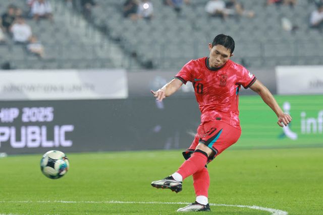 7일 경기도 용인미르스타디움에서 열린 2025년 동아시아축구연맹(EAFF) E-1 챔피언십(동아시안컵) 남자부 한국과 중국의 경기. 한국 이동경이 슛하고 있다. 사진=연합뉴스