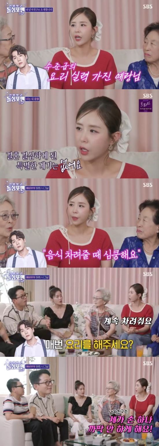 신지는 "문원이 음식 차려줄 때 심쿵한다. 음식이 정말 맛있다. 요리를 잘한다. 계속 밥을 차려주고, 설거지까지 다 해준다. 진짜로 손 하나 까딱 안하게 한다"고 자랑했다.