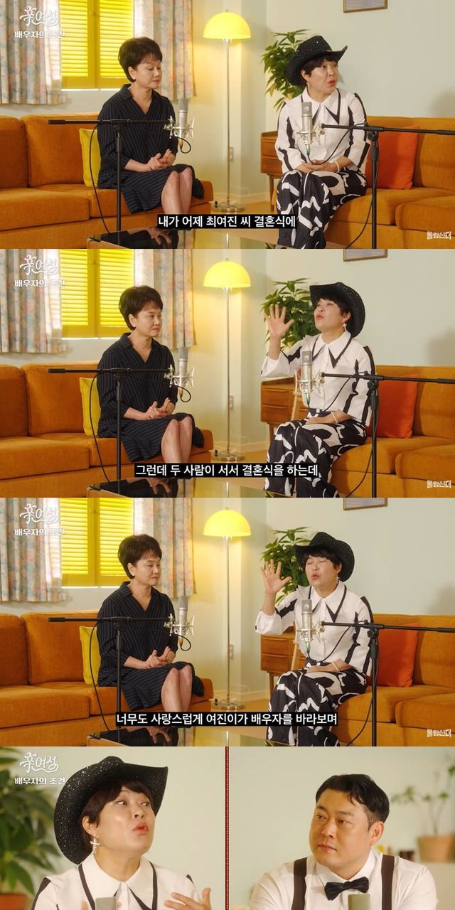 이경실은 "여진이랑 나랑 '라디오스타'를 하면서 여진이가 한 얘기가 있다. 자기가 그동안의 외적 조건의 외모를 얘기했던 것과 지금의 남편이 다르다더라"며 "그분을 만나면서 느꼈던 게 내적 조건, 성격 이런 게 자기가 바라던 이상형이었다는 거다. 그게 정말 맞으니까 외적 조건이 안 보였다는 것"이라고 부연했다.