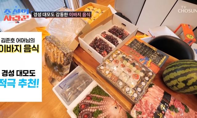 이날 김준호 어머니가 정성껏 준비한 이바지 음식이 집 앞에 도착하자 김지민은 깜짝 놀랐다. 차 안 가득 고급 음식이 실려있었던 것. 인삼, 대왕 문어, 참깨, 한우, 떡, 망고, 홍삼정과, 활전복 등 고급 식재료로 구성된 어마어마한 양의 음식이 놀라움을 자아냈다.