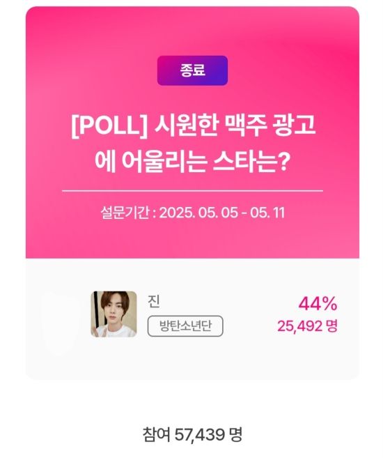 (엑스포츠뉴스 이정범 기자) BTS 진이 맥주 광고 설문 1위에 올랐다.