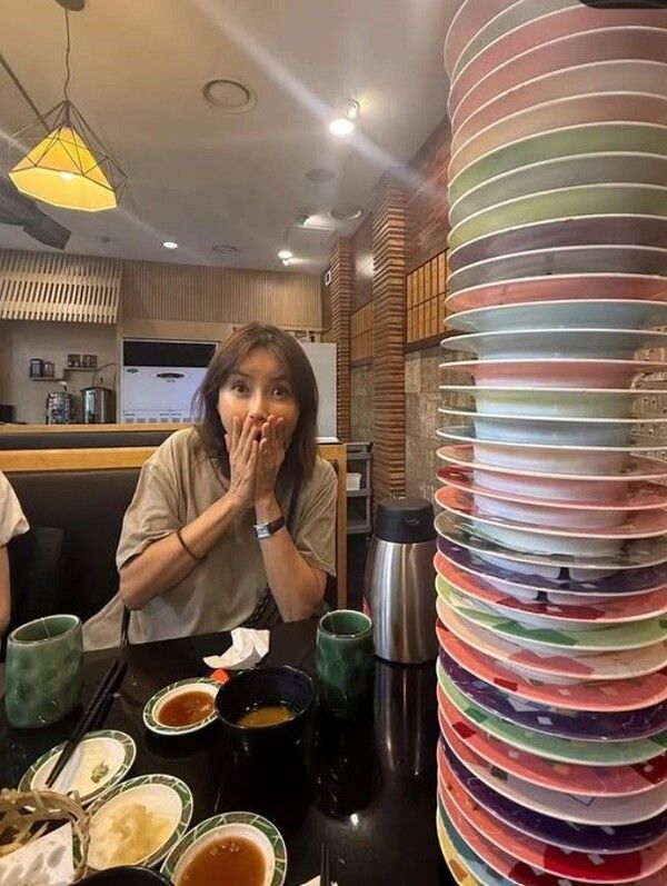 사진에는 식당 테이블 위로 높게 쌓인 스시 접시가 눈길을 끈다. 신애라는 두 손으로 입을 가린 채 놀란 표정을 지어 웃음을 자아냈다.