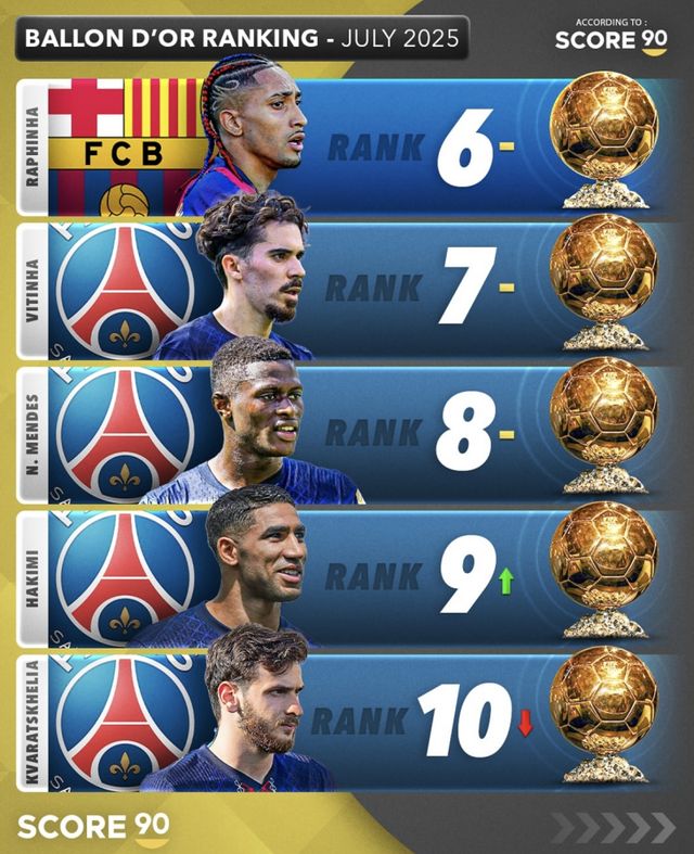 6~10위에는 하피냐(바르셀로나), 비티냐, 누누 멘데스, 아슈라프 하키미, 흐비차 크바라츠헬리아(이상 PSG)가 차례로 이름을 올렸다.