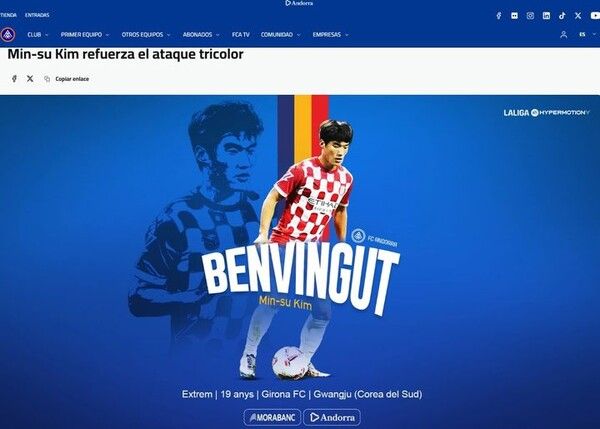 뉴시스 보도에 따르면, 안도라는 지난 15일(한국 시간) 홈페이지를 통해 "지로나와 김민수 임대 계약을 맺었다. 그는 오늘 오후 이바이 고메스 감독과 첫 프리시즌 훈련을 소화할 예정"이라고 알렸다.
