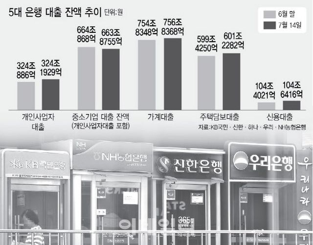 16일 금융권에 따르면 KB국민·신한·하나·우리·NH농협은행 등 5대 은행의 개인사업자 대출 잔액은 이달 들어 2주가 지난 14일 기준 324조 1929억원으로 집계됐다. 6월 말(324조 886억원)과 비교해 사실상 변화가 없다. 특히 중소기업 대출(개인사업자 대출 포함)은 같은 기간 664조 868억원에서 663조 8755억원으로 약 2000억원 줄었다. 시중은행이 중기·소상공인 대출을 늘릴 유인이 없다는 방증이다.