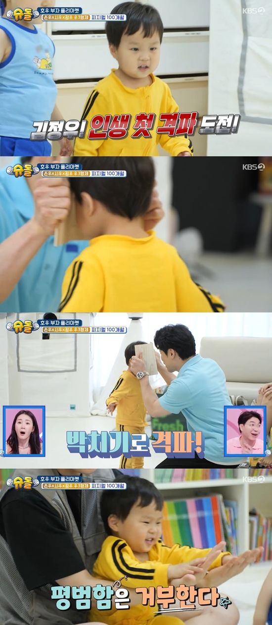 시우가 태권도 시범에 나섰다. 이에 김준호는 "우리 정우도 보여주자"라며 정우에게 시우와 같은 노랑 트레이닝복을 입혔다. 이에 최지우는 "준호 아빠 승부욕 붙었냐"라고 말했다.