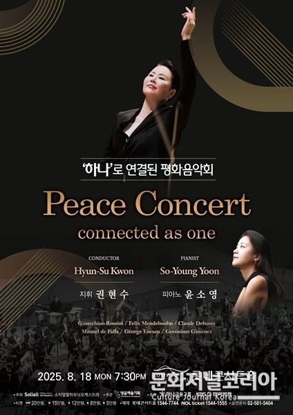 문화저널코리아 오형석 기자 | 소리얼필하모닉오케스트라 김기웅 단장이 기획하고 이끄는 '하나로 연결된 평화음악회'가 오는 8월 18일(일) 오후 7시 30분, 롯데콘서트홀에서 개최된다.