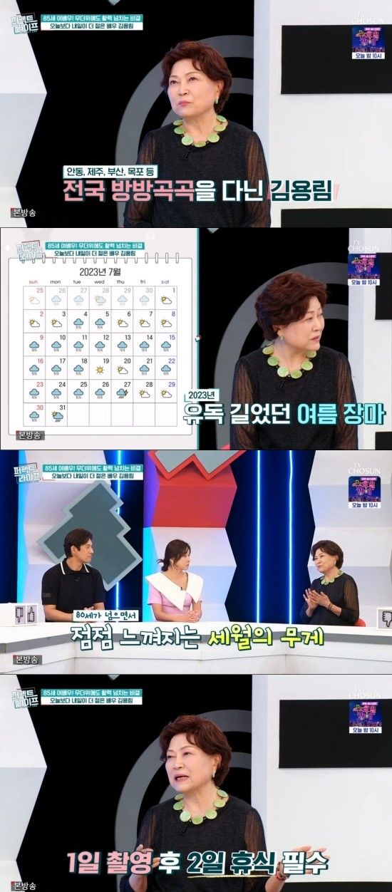 건강에 대해 묻자 김용림은 "아직까지 특별히 아픈 곳은 없다. 그런데 역시 조금씩 다르긴 하더라. 80세까지는 몰랐는데 82세부터는 촬영 후 이틀은 쉬어야 편한 것 같다"고 남다른 체력을 자랑했다.
