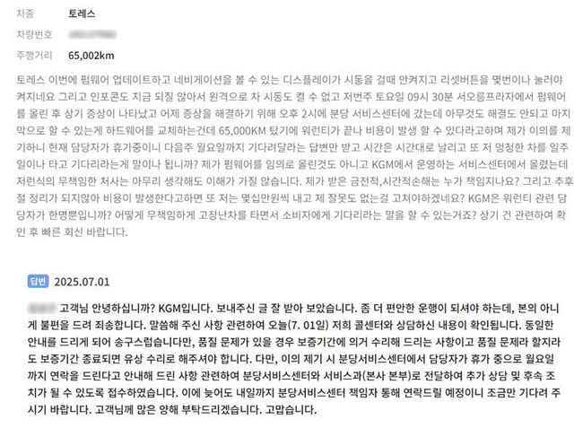 제조사의 공식 펨웨어 업데이트를 받자 차에 오류가 생겼다. 하지만 제조사 KG모빌리티(이하 KGM)는 차량 보증기간이 끝났다며 고객에게 수리 비용이 발생할 수 있다고 안내했다. 규정을 운운하던 KGM은 피해자가 소비자원에 고발하자 무상 수리안을 내놨다.