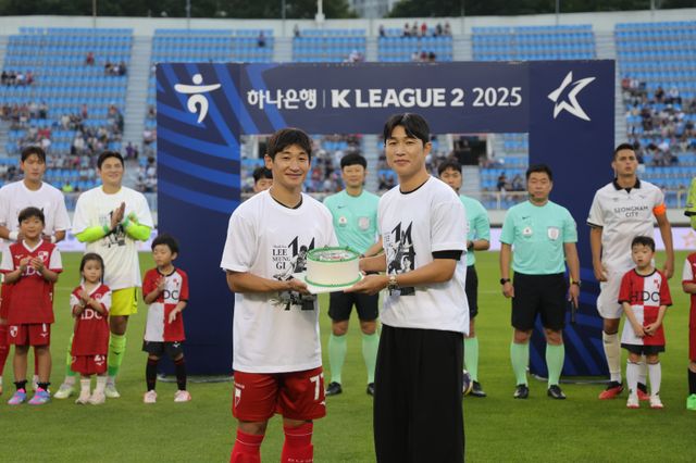 이승기(오른쪽)가 지난 12일 부산구덕운동장에서 열린 성남FC와의 하나은행 K리그2 2025 20라운드를 앞두고 부산 주장 장호익으로부터 기념 케이크를 전달받고 있다. 사진=부산