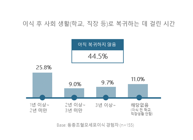 이식 후 회복과 사회 복귀도 녹록지 않다. 전체 이식 경험자의 45%는 여전히 사회복귀를 하지 못한 상태였다. 이는 신체적·심리적 부담이 단순한 회복의 문제를 넘어, 환자의 삶 전반에 지속적인 영향을 미치고 있음을 보여준다.