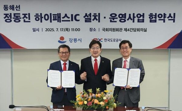 한국도로공사가 17일 서울 영등포구 국회 의원회관에서 강원도 강릉시와 '동해고속도로 정동진 하이패스나들목(IC) 설치'를 위해 업무협약을 체결했다고 밝혔다.