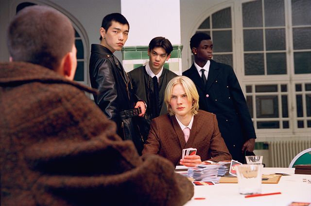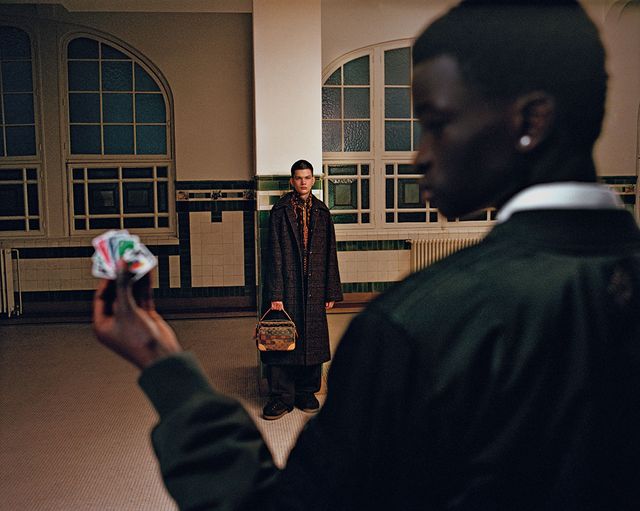 워크웨어 테일러드 코트와 롱 슬리브 셔츠, 테일러드 팬츠 모두 LouisVuitton.