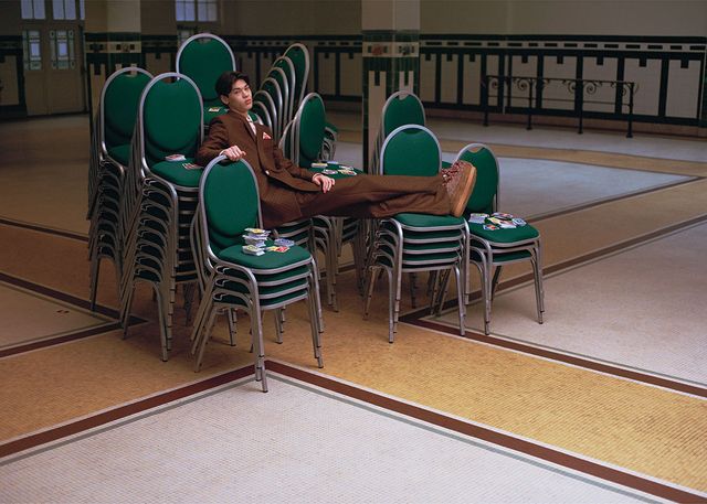 모노그램 테일러드 기모노 재킷과 클래식 롱 슬리브 셔츠, 모노그램 테일러드 팬츠, 핑크 타이, 레이스업 슈즈 모두 Louis Vuitton.