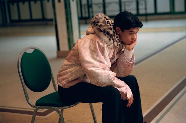 워크웨어 테일러드 코트, 클래식 롱 슬리브 셔츠, 테일러드 팬츠, 블랙 타이 모두 Louis Vuitton.
