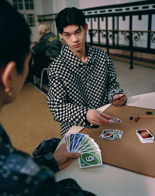 크롭트 보머 재킷, 롱 슬리브 셔츠 모두 Louis Vuitton.