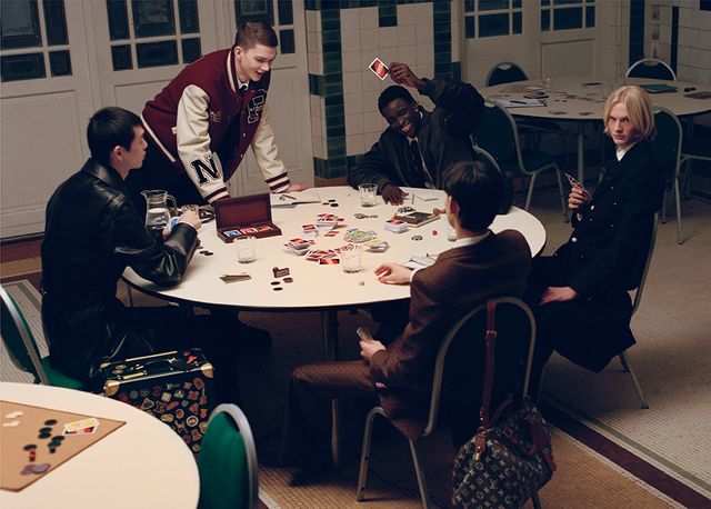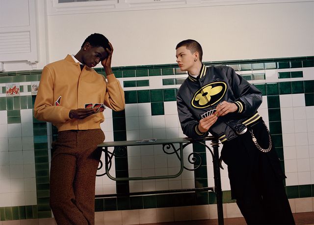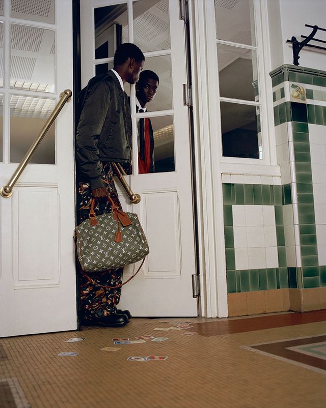 MTO 그래픽 에피 레더 바시티 재킷과 화이트 셔츠, 워크웨어 쇼츠, 블랙 타이, 다미에 벨트 모두 Louis Vuitton.