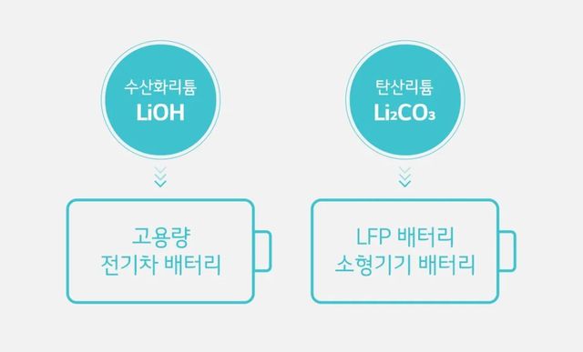 수산화리튬의 경우 니켈과 반응성이 좋고 합성이 용이한 성질을 가진다. 때문에 주로 삼원계 NCM(니켈·코발트·망간) 배터리용 하이니켈 양극재의 원료로 사용된다. 에너지 밀도가 높고 용량이 큰 배터리에 적합한 원료로 장거리 전기차용 배터리 소재로 쓰인다.