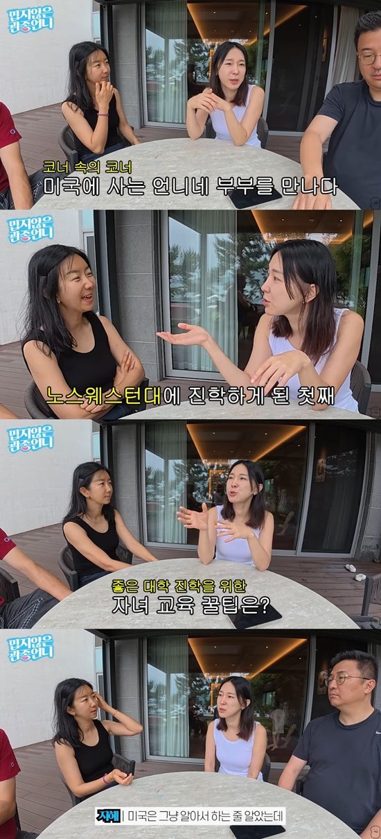 이지혜는 "미국도 엄마가 많이 서포트를 해줘야 하는구나. 미국은 그냥 알아서 하는 줄 알았는데"라며 놀라움을 숨기지 못했다. 이지혜의 형부가 "지혜한테 (미국 유학을) 추천할 거냐?"라고 묻자, 친언니는 "정말 엄마가 하는 거 잘 따라서 열심히 공부 잘하는 애들은 한국이 더 맞는다"라고 말했다.