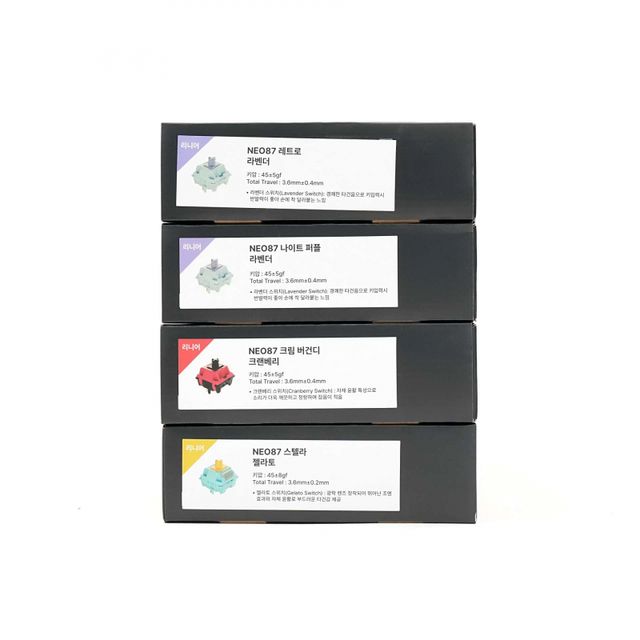 NEO87 시리즈는 총 4가지 스타일로 출시됐다. 숫자키를 뺀 텐키리스 레이아웃을 적용해 어느 공간에서나 여유롭게 사용할 수 있다. 컬러에 따라 ‘레트로’와 ‘나이트 퍼플’, ‘크림 버건디’, ‘스텔라’로 구분된다. 레트로와 나이트 퍼플에는 라벤더축이, 크림 버건디에는 크랜베리축이 스텔라에는 젤라토축이 적용된다. 세 축 모두 45gf 키압과 3.6mm 스트록을 갖고 있다. 가장 일반적으로 사용되는 키압과 스트록으로 어느 스위치를 선택해도 어려움 없이 적응할 수 있다.