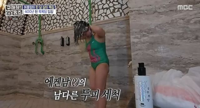수영복을 입은 박나래는 샤워기의 물을 시원하게 맞으며 온천을 즐겼다.