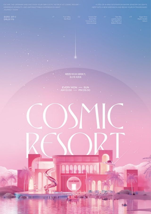 코스믹 리조트는 ‘우주(Cosmic)’와 ‘리조트(Resort)’가 만나는 이색적인 휴양 공간으로, 일상에서 벗어나 감각적이고 색다른 체험을 제공하는 복합 엔터테인먼트 공간이다. 총 1400평 2층 규모의 공간에서 펼쳐지는 13가지 특별한 테마 공간은 우주적 판타지를 바탕으로 기획됐으며, 이는 단순한 전시가 아닌 관람객의 참여와 상호작용을 통해 감각적이고 몰입감 넘치는 새로운 경험을 제공한다.