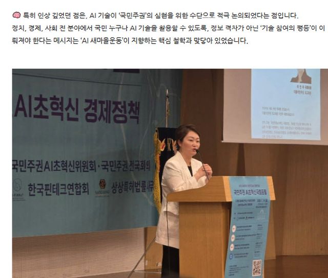 그는 “AI는 단지 기술이 아닌 민주주의의 작동 방식까지 재편하는 문명 전환의 핵심 변수”라며 “국가가 국민을 대표해 인공지능의 방향을 통제하는 ‘국민주권형 소버린 AI’가 AI 3강 실현의 핵심 과제가 되어야 한다”고 했다.