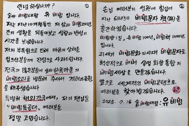 유비빔은 지난 16일 자신의 소셜미디어(SNS)에 자필 편지를 게재, “지난 10개월 동안 제 삶과 비빔 20년간의 생활을 되돌아보고 성찰과 반성의 시간을 보냈다, 제 부족함으로 인해 마음의 상처를 입으신 분들께 진심으로 사과드린다”고 전했다.