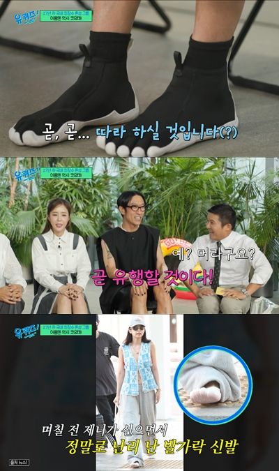 이에 박명수는 "굉장히 관심 있다"며 흥미를 보였고, 이어 전민기는 "이효리, 신민아, 블랙핑크 제니까지 스타들의 선택을 받은 패션 아이템이 있다"면서 "발가락 하나하나 다 드러나는 발가락 신발"이라고 소개했다.