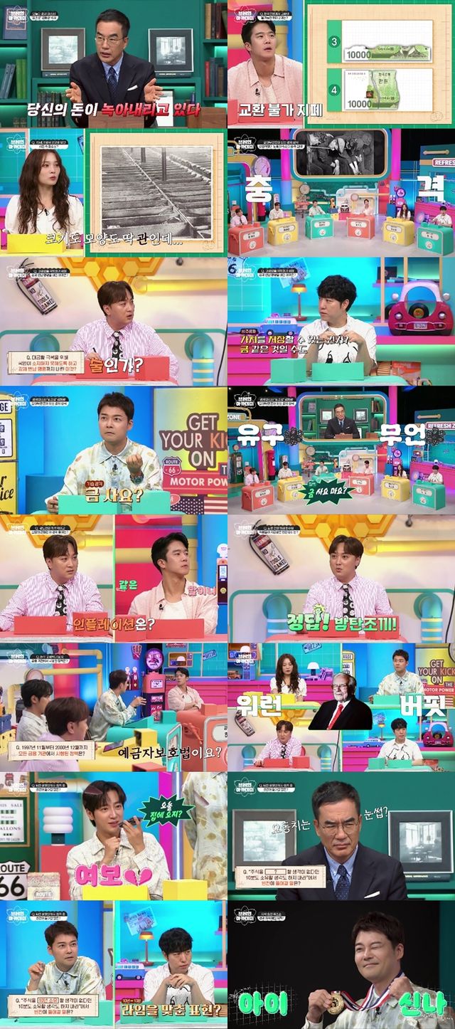 다음으로, 김동환은 “이들이 공통으로 말하는 경제 용어는 무엇일까?”라는 퀴즈와 함께 레이건의 말인 ‘모든 미국인에게 ( )은 강도만큼 폭력적이고 무장 강도만큼 무섭고, 암살자만큼 치명적이다’와 대처의 말인 ‘( )은 실험의 근원이다. 그것은 저속한 사람들의 보이지 않는 도둑이다’를 보기로 내놨다. 이에 하석진은 “물가”라고 추론했고, 황제성은 “인플레이션?”이라며 정답을 맞혔다. 김동환은 “지금 한국도 인플레이션이다. 가치가 보존되는 걸 찾아 분산 투자를 해야 한다”고 경제 꿀팁을 선사했다. 나아가 김동환은 ‘일본 경제’에 대해서도 “일본이 초호황기 당시 ‘세계 50대 기업 순위’ 중 1위는 물론, 10위 안에 8개나 포진해 있었다. 그런데 51개월간의 광란의 투자 끝에 정부가 문제를 감지하고 금리를 올리면서 경제가 붕괴되기 시작됐다”고 밝혔다. 이와 함께 그는 ‘일본 버블 경제 붕괴 이후, 일부 은행의 채권 회수팀 직원들이 특별히 지급받은 안전 장비는?’이라는 퀴즈를 냈다. 궤도는 “헬멧”이라고 답했고, 황제성은 “알았다! 방탄조끼다”라고 해 정답을 맞혔다.