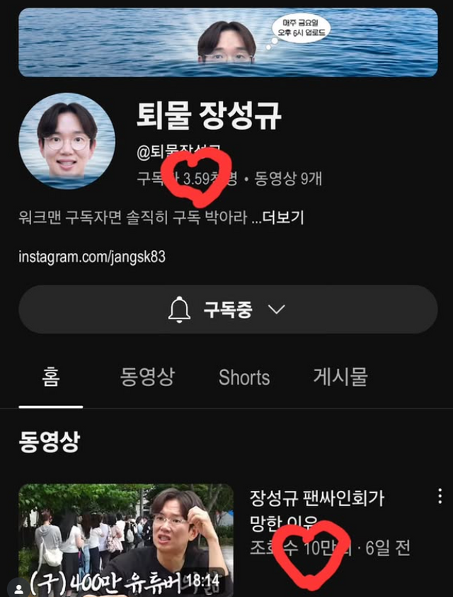 함께 공개된 사진에는 장성규의 신규 유튜브 채널 페이지가 담겨 있으며, 구독자 3.59천 명과 동영상 조회수 10만 회가 눈길을 끈다.